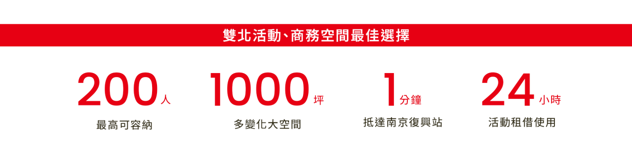 RED SPACE 獨家空間優勢 多變空間配置 可獨立使用也能自由串聯,彈性搭配滿足各種活動規模。 200人以上容納力 稀有市中心大型空間,一次就能滿足上百人會議、發表會需求。 可搭建舞台、展演場景 內建LED牆、燈光設施、舞台區,展演或走秀都能高規登場。 器材進場便利 備有油壓貨梯與空曠通道,大型器材輕鬆進出。 場控動線流暢設計 各區動線獨立、不交錯,支援分流報到、分組活動、周邊展示。 交通 1 分鐘可達捷運站 步行 1 分鐘到南京復興站,來賓輕鬆到場不迷路。